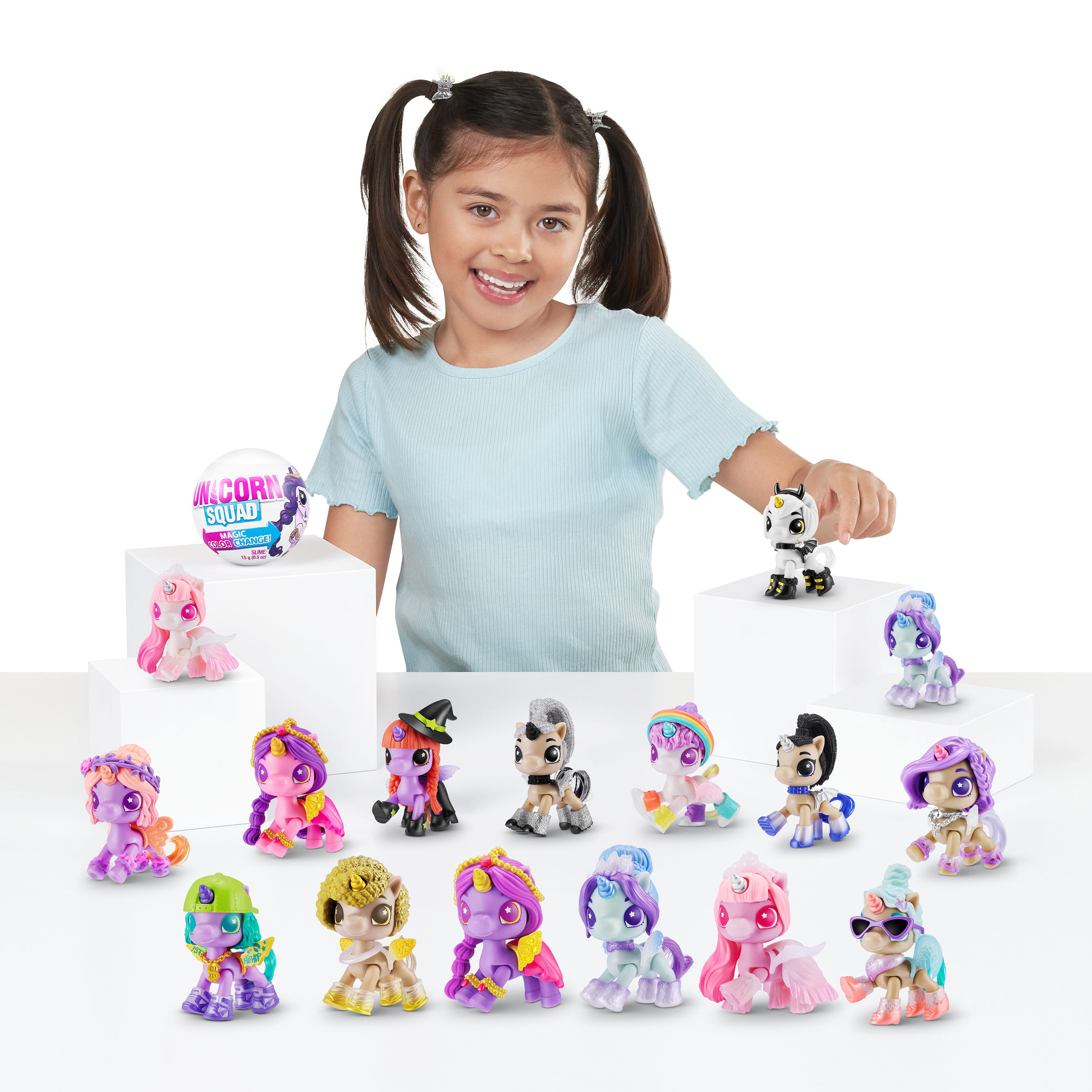 5 Surprise Unicorn Squad — большая компания единорогов. Откройте для себя абсолютно новый отряд — Magic Color Change! Искупайте свою волшебную лошадку, чтобы увидеть, как она меняет цвет. Всего в коллекции 13 единорогов, каждый из которых обладает уникальным внешним видом и имеет свои забавные аксессуары. Расчешите длинную гриву, дополните образ лошадки модными аксессуарами и поиграйте со слаймом. Соберите коллекцию из 13 волшебных единорогов, меняющих цвет. Сможете ли вы найти сверхредкого с серебряным блеском в волосах? Создайте уникальный стиль для своего отряда единорогов. Украсьте нового друга аксессуарами, чтобы он засиял. Игрушка подарит ребёнку ощущение чуда и предвкушение, а попавшиеся сюрпризы станут отличными участниками игр! В комплекте: 1 единорог Color Change Unicorn; 2 аксессуара для единорога; 1 расчёска единорога; 4 модных аксессуара феи единорога; 1 руководство для коллекционеров.